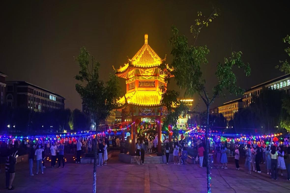 傍晚的仁心湖畔熱鬧非凡,學(xué)生們身著漢服,手握折扇,以古韻之美游園迎中秋。玩轉(zhuǎn)燈謎、雅歌投壺、玉兔燈籠、月球花燈、月下祈福、古風(fēng)合影……,各式活動(dòng)層出不窮,現(xiàn)場(chǎng)散發(fā)著濃郁的節(jié)日氛圍。在各二級(jí)學(xué)院中秋晚會(huì)分會(huì)場(chǎng),集體舞蹈、歌曲、朗誦、合唱等節(jié)目精彩紛呈,師生同樂,沉浸在歡笑與喜悅中。