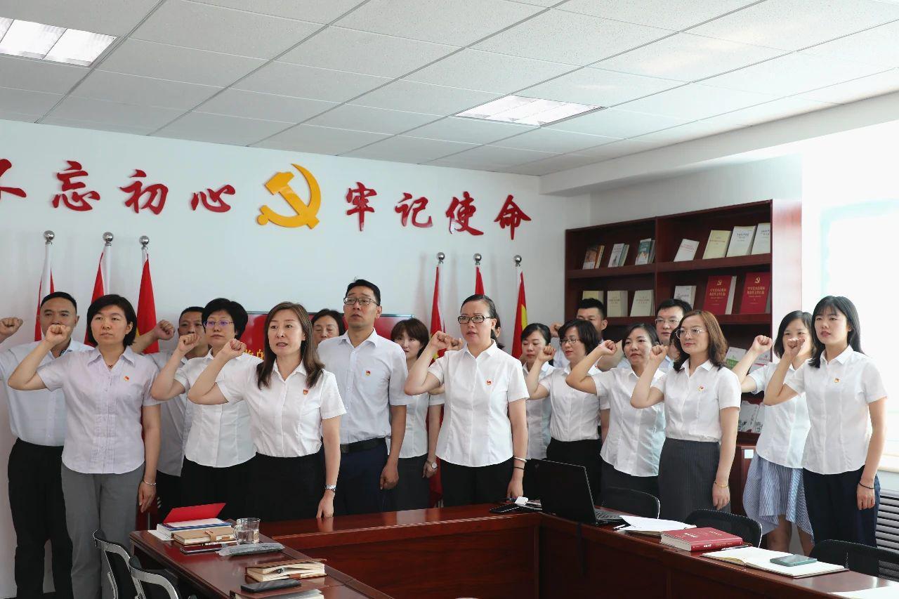 在銀座幼教黨總支書(shū)記、董事長(zhǎng)袁霞帶領(lǐng)下,全體黨員重溫入黨誓詞。