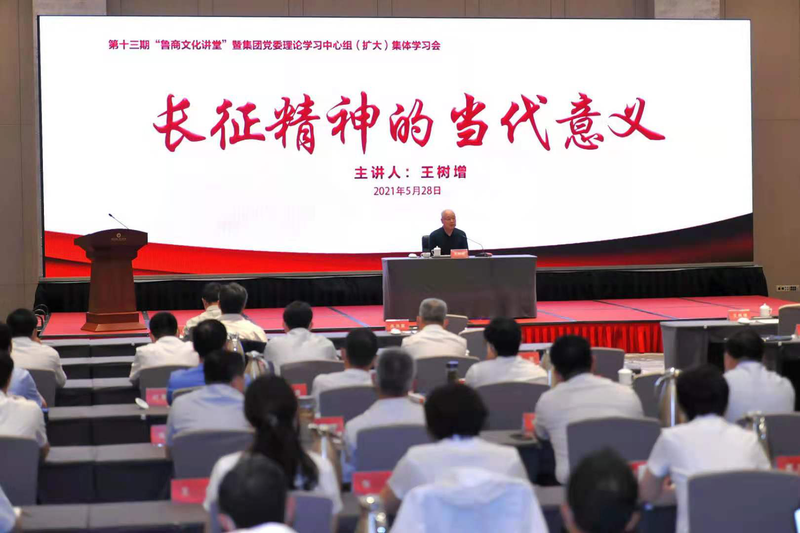 5月28日下午,第十三期“魯商文化講堂”暨集團黨委理論學習中心組(擴大)2021年第9次集體學習會召開。魯商集團黨委書記、董事長兼國欣文旅董事長高洪雷,黨委副書記、總經理郭訓成,黨委副書記劉守亮,黨委常委、組織部部長李林,黨委常委、總審計師、工會主席劉德華出席。省委黨史學習教育第十五巡回指導組成員、省市場監管局標準化處一級調研員趙秀水,省財金投資集團紀委(監察專員辦公室)案件管理室主任孟磊到會指導。會上,國家一級作家、中國作家協會全國委員會委員、央視《百家講壇》主講人王樹增教授作了《長征精神的當代意義》主題講座。