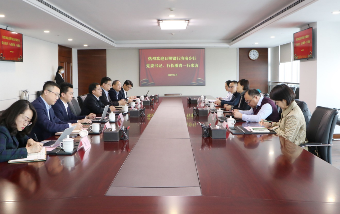 2月22日,日照銀行濟南分行黨委書記、行長潘青到訪魯商集團,集團黨委副書記、董事、副總經理朱華建熱情接待并舉行座談。