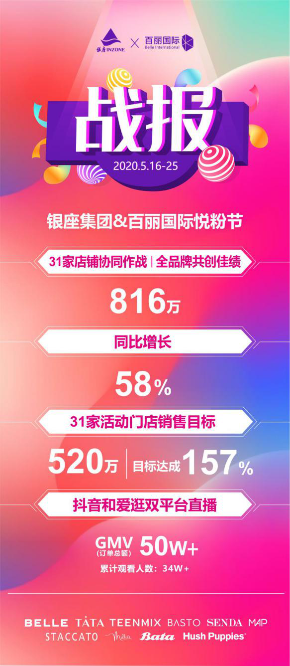 5月16日,銀座集團攜手百麗國際開展為期10天的“百麗悅粉節“大型品牌聯合營銷活動,31家門店+百麗13個鞋履品牌強強聯合,3000個sku 1折起售。5月25日,活動完美收官,刷新各項記錄。