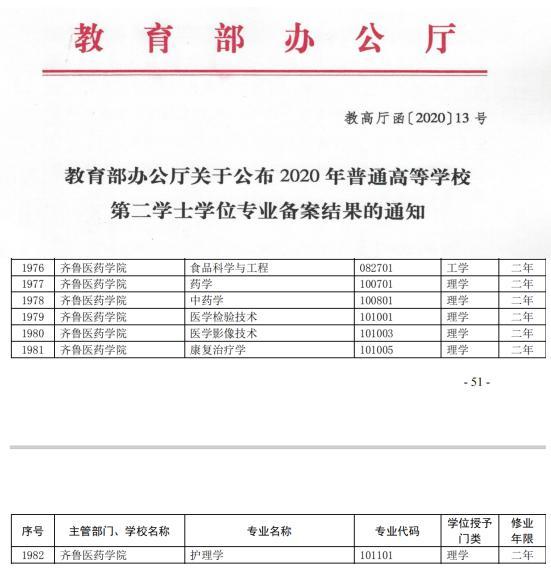 近日,從教育部辦公廳《關于公布2020年普通高等學校第二學士學位專業(yè)備案結(jié)果的通知》(教高廳函〔2020〕13號)文件獲悉,齊魯醫(yī)藥學院申報的藥學、中藥學、食品科學與工程、醫(yī)學檢驗技術、醫(yī)學影像技術、康復治療學、護理學等7個第二學士學位專業(yè)順利通過評審,增列為學院第二學士學位備案專業(yè)。