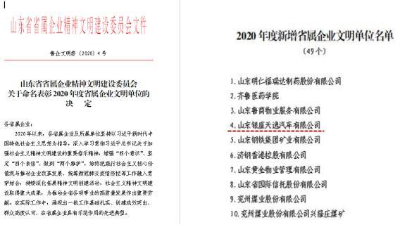 近日,山東省省屬企業精神文明建設委員會印發了《關于命名表彰2020年度省屬企業文明單位的決定》,山東銀座天逸汽車有限公司(簡稱銀座天逸)成功獲評“省屬企業文明單位”。
