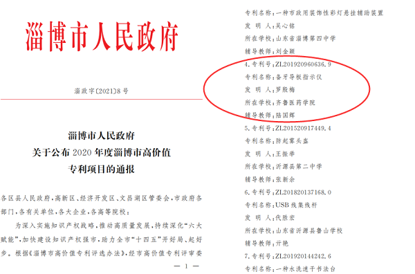 近日,從《淄博市人民政府關于公布2020年度淄博市高價值專利項目的通報》(淄政字〔2021〕8號)文件獲悉,齊魯醫藥學院1項專利被評為2020年度淄博市優秀學生發明項目。獲獎專利為口腔醫學院羅殷梅同學發明的實用新型專利《備牙導板指示儀》,指導教師陸國輝。