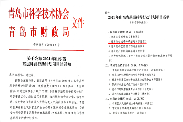 按照山東省科協(xié)、省財(cái)政廳《關(guān)于實(shí)施2021年山東省基層科普行動(dòng)計(jì)劃的通知》(魯科協(xié)發(fā)〔2021〕2號(hào))要求,青島市科協(xié)、市財(cái)政局聯(lián)合開展了“2021年青島市基層科普行動(dòng)計(jì)劃”項(xiàng)目申報(bào)工作,學(xué)院積極組織申報(bào),經(jīng)李滄區(qū)科協(xié)推薦、市科協(xié)組織專家評(píng)審,學(xué)院青島餑餑榼子傳承基地得到了專家的一致認(rèn)可,順利入選2021年山東省基層科普行動(dòng)計(jì)劃項(xiàng)目。