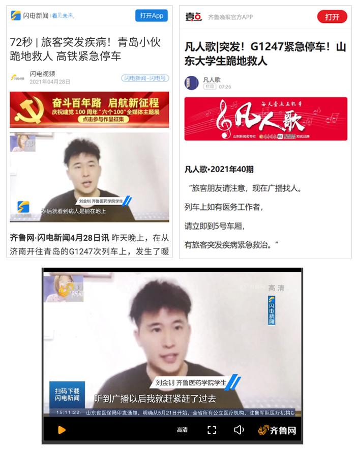 4月27日20:01分,在濟(jì)南站開往青島北站的G1247次列車上,一旅客突發(fā)暈厥、渾身抽搐。緊急時刻,齊魯醫(yī)藥學(xué)院學(xué)生劉金釗挺身而出、果斷出手,與列車員、熱心旅客一同展開施救。“當(dāng)時第一反應(yīng)不是害怕,而是想幫著旅客渡過危險期,把我在學(xué)校學(xué)到的專業(yè)知識和急救技能全部用上,盡最大的努力為病人減輕痛苦,爭取延續(xù)生命的機(jī)會。” 談到此次救人行為,劉金釗這樣說。他的事跡,先后被山東電視臺新聞頻道、齊魯晚報、齊魯壹點(diǎn)、海報新聞等10多家媒體關(guān)注報道。
