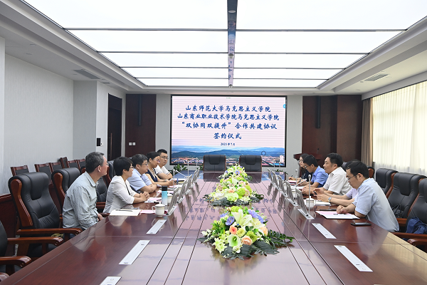 山東商院馬克思主義學(xué)院與山東師范大學(xué)馬克思主義學(xué)院在遵循“資源共享、優(yōu)勢(shì)互補(bǔ)、合作共贏”原則的基礎(chǔ)上,經(jīng)友好協(xié)商,建立共建關(guān)系,將開展“馬克思主義理論學(xué)科建設(shè)、理論研究、師資隊(duì)伍建設(shè)和人才培養(yǎng)工作、長(zhǎng)效交流機(jī)制、特色合作項(xiàng)目推進(jìn)”等一系列合作。