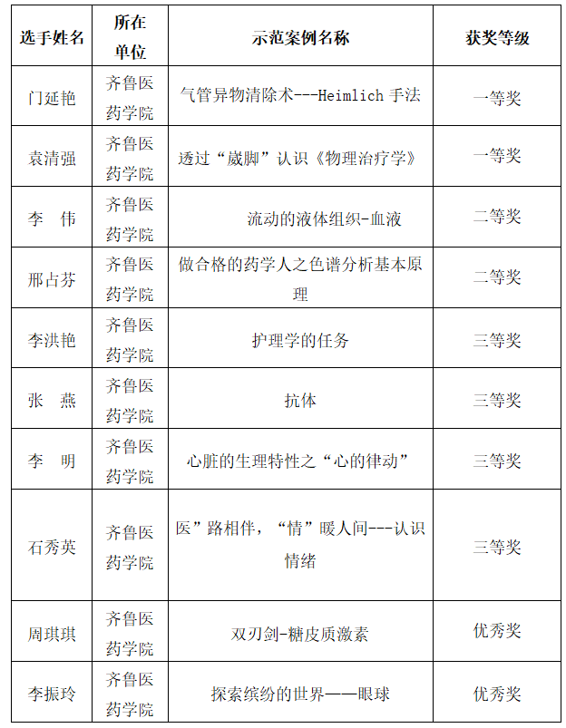近日,省高等醫學教育研究中心公布了2021年度省高等醫學院校課程思政示范案例評選結果,齊魯醫藥學院申報的10項案例全部獲獎,其中一等獎2項、二等獎2項、三等獎4項、優秀獎2項。