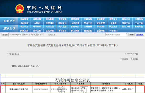 8月29日,央行公布非銀行支付機(jī)構(gòu)《支付業(yè)務(wù)許可證》續(xù)展公示信息,易通金服《支付業(yè)務(wù)許可證》順利續(xù)展。