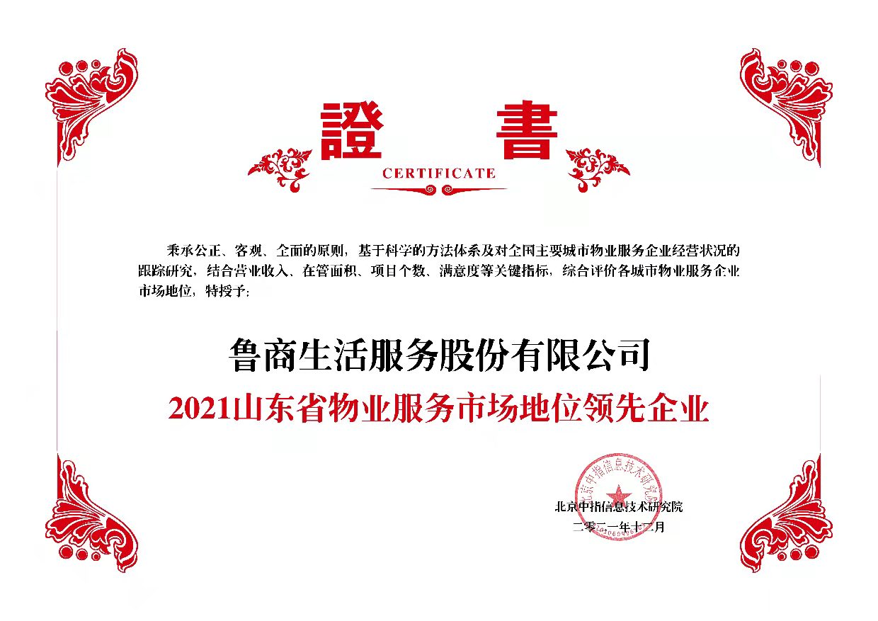 12月2日,由北京中指信息技術(shù)研究院主辦,中國(guó)房地產(chǎn)指數(shù)系統(tǒng)、中國(guó)物業(yè)服務(wù)指數(shù)系統(tǒng)承辦的“2021中國(guó)房地產(chǎn)大數(shù)據(jù)年會(huì)暨2022中國(guó)房地產(chǎn)市場(chǎng)趨勢(shì)報(bào)告會(huì)”召開。魯商服務(wù)憑借創(chuàng)新的服務(wù)文化和優(yōu)秀的服務(wù)品質(zhì)榮獲“2021山東省物業(yè)服務(wù)市場(chǎng)地位領(lǐng)先企業(yè)”榮譽(yù)稱號(hào)。