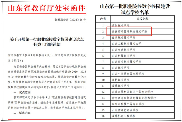 近日,省教育廳發(fā)布通知,青島酒店學(xué)院入選第一批職業(yè)院校數(shù)字校園建設(shè)試點(diǎn)單位。