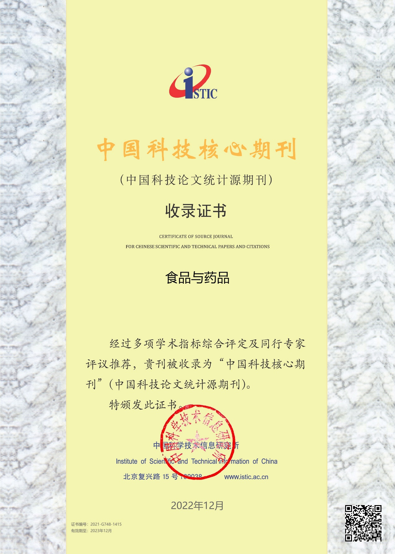 近日,2022年中國(guó)科技核心期刊(中國(guó)科技論文統(tǒng)計(jì)源期刊,CSTPCD)目錄發(fā)布,由山東省商業(yè)集團(tuán)有限公司主管和山東省藥學(xué)科學(xué)院主辦的《食品與藥品》實(shí)現(xiàn)連續(xù)多年入選此目錄。