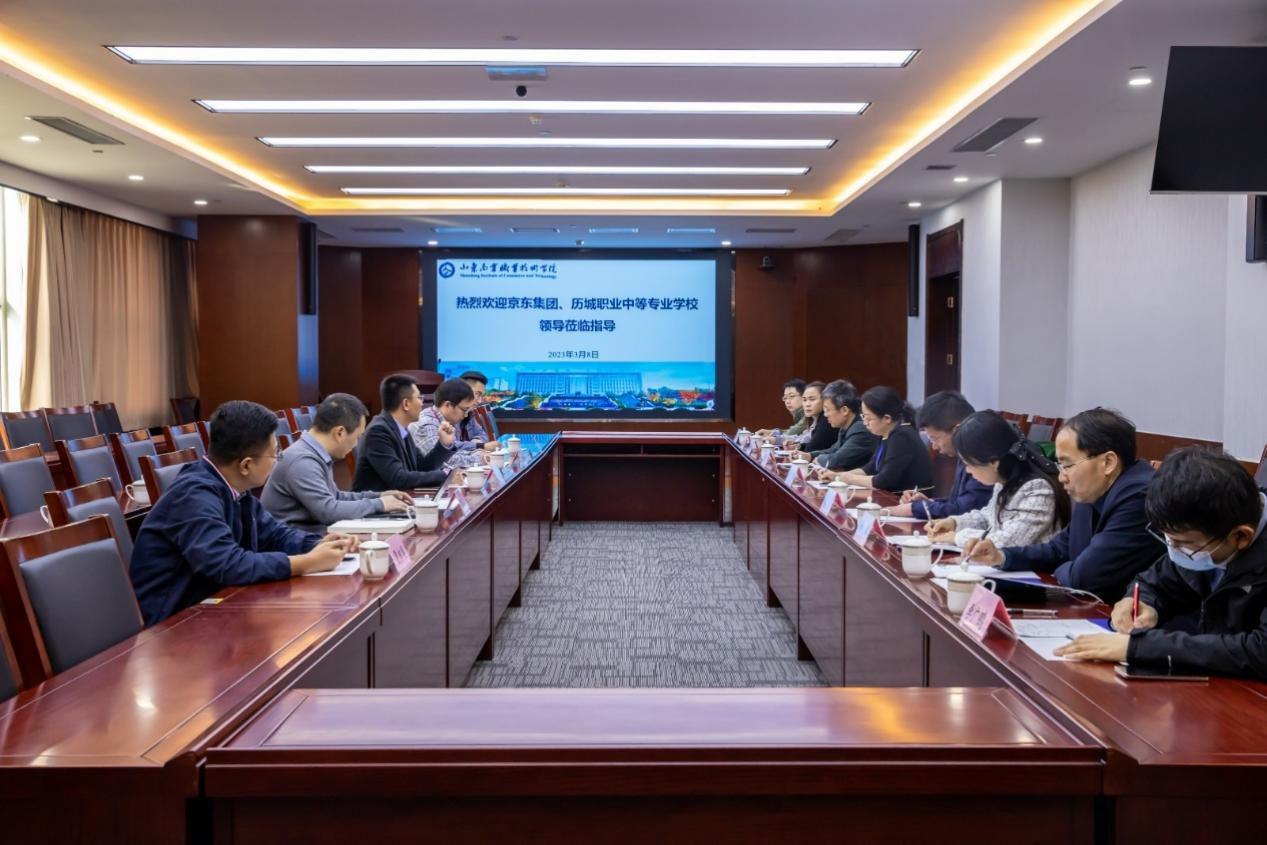 3月8日,京東集團京東物流科技副總裁范廣輝一行到訪山東商院,就京東產業(yè)學院建設工作進行研討。山東商院黨委副書記、院長王鑫,黨委副書記宋超,濟南市歷城職業(yè)中等專業(yè)學校校長趙波參加會議。