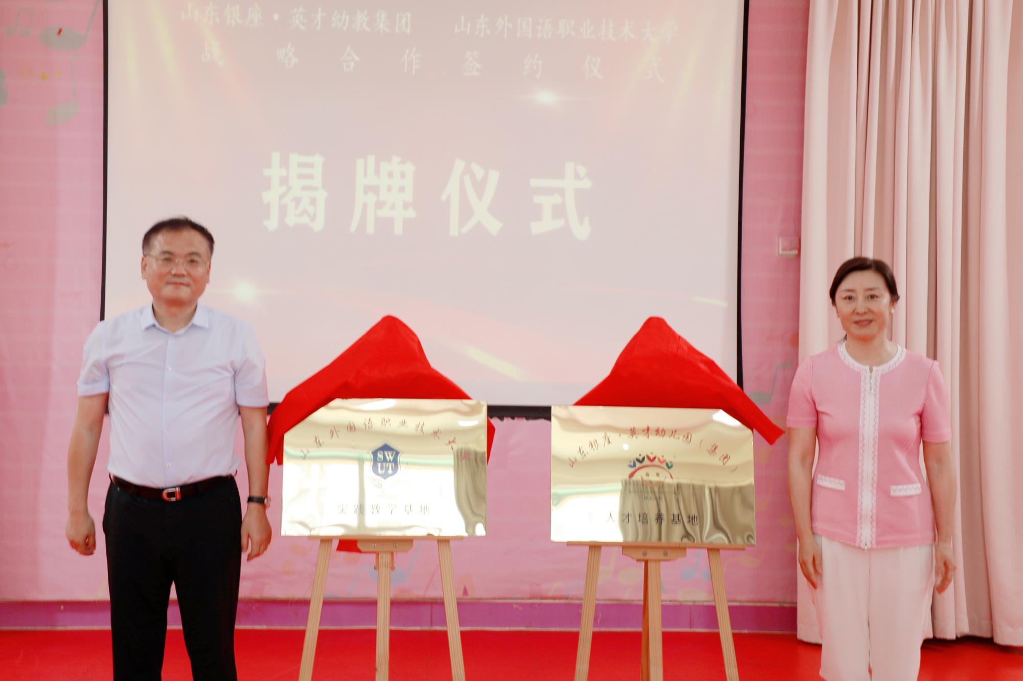 銀座幼教黨委書記、董事長袁霞與拜文匯共同為“銀座幼教人力資源培養基地”和“山東外國語職業技術大學實踐教學基地”揭牌。