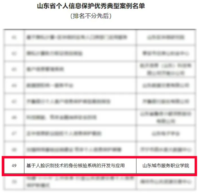 近日,山東省個人信息保護(hù)優(yōu)秀典型案例名單公布,山東城市服務(wù)職院“基于人臉識別技術(shù)的身份核驗系統(tǒng)的開發(fā)與應(yīng)用”案例成功入選。