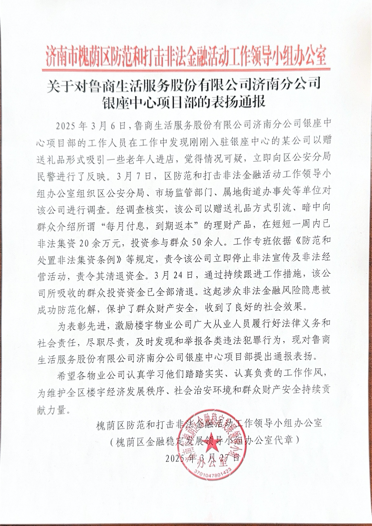 近日,魯商服務(wù)濟南銀座中心受到濟南市槐蔭區(qū)金融穩(wěn)定發(fā)展領(lǐng)導(dǎo)辦公室的通報表揚,高度贊譽項目團隊在防范非法集資活動中的表現(xiàn)。