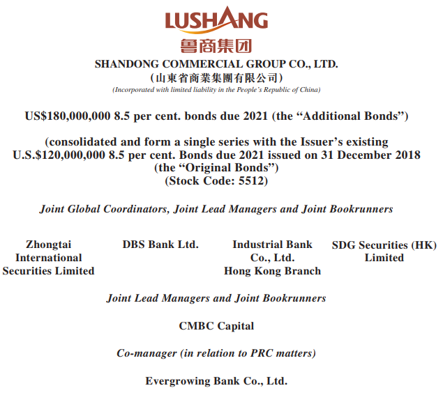 Application has been made to The Stock Exchange of Hong Kong Limited for the listing of and permission to deal in the Additional Bonds by way of debt issues to professional investors (as defined in Chapter 37 of the Rules Governing the Listing of Securities on The Stock Exchange of Hong Kong Limited and in the Securities and Futures Ordinance (Cap.571) of Hong Kong) only, as described in the supplemental offering circular dated 3 June 2019. The listing of the Additional Bonds is expected to become effective on 23 December 2019.