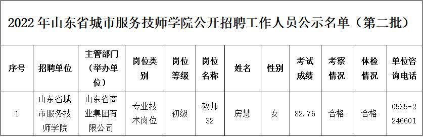 根據《中共山東省委組織部、山東省人力資源和社會保障廳關于印發2022年度省屬事業單位公開招聘工作實施方案的通知》魯人社發〔2021〕18號)等相關規定,山東省城市服務技師學院經過公開招聘報名、考試、考察、體檢等工作,現對擬聘用人員(第一批)進行公示,公示期為7個工作日,自2022年8月22日至2022年8月30日(不含節假日)。公示期間,如對公示人選有異議,請及時向山東省商業集團有限公司反映。